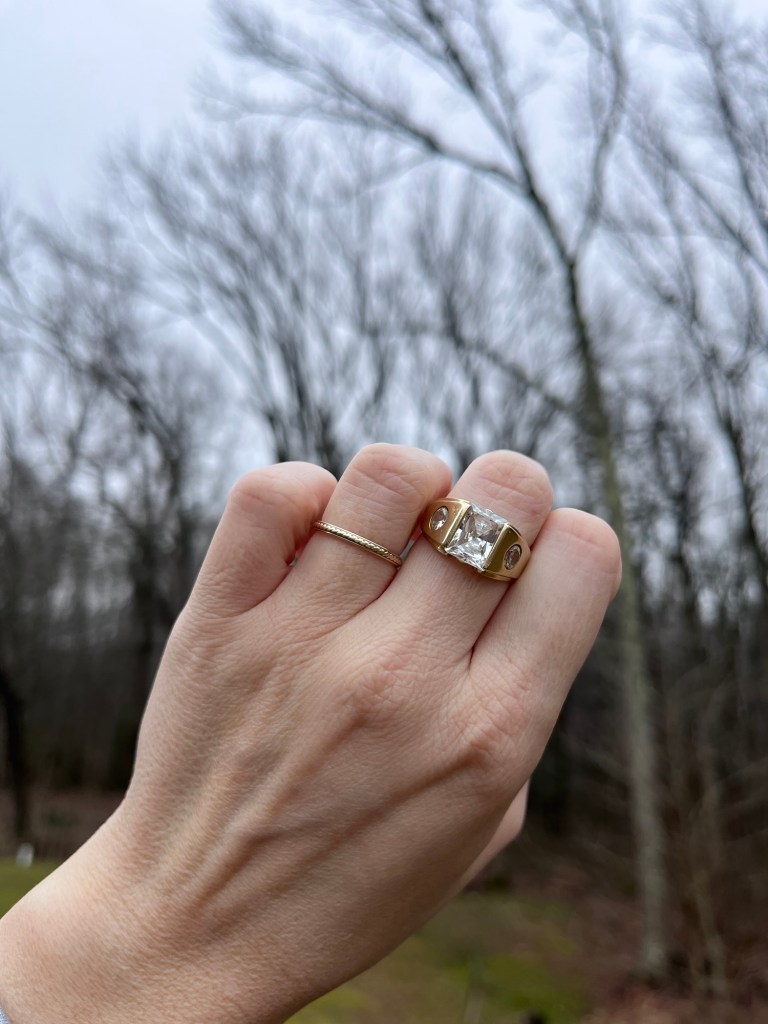 1980s CZ emerald cut cigar band, size 9.25, 14K gold